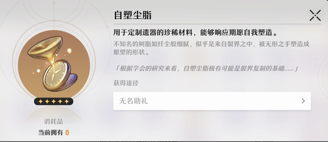 勛禮中有2個(gè)特殊的物品,一個(gè)是可以定制遺物屬性的自塑塵脂,另一個(gè)是可以自選光錐的星海寶藏