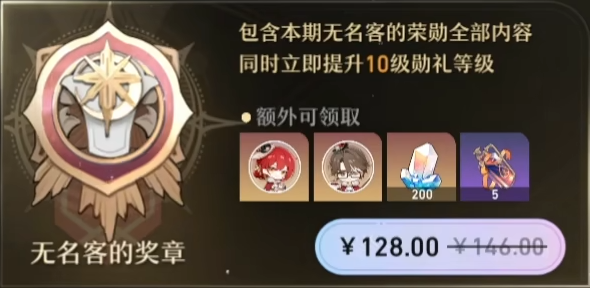 注:購買無名客的獎(jiǎng)?wù)驴上硎?.5折(原價(jià)146RMB),無名客的榮勛可以升級成無名客的獎(jiǎng)?wù)碌遣幌硎苷劭郏?8RMB+78RMB=146RMB>128RMB)。