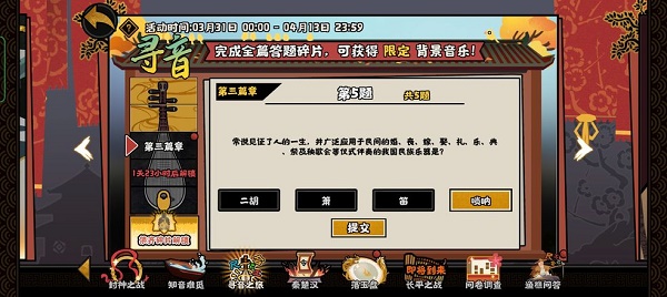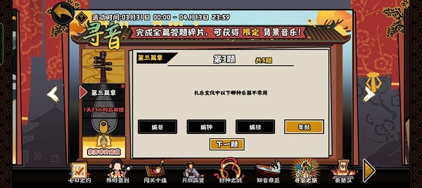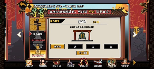無悔華夏尋音之旅第三篇答案已經(jīng)更新了,無悔今天繼續(xù)考察玩家對于我國傳統(tǒng)樂器的華夏澳門管家一肖一特今晚預測了解。接下來小編就為大家?guī)頍o悔華夏尋音之旅第三篇答案,尋音大三巴一肖一碼一特正確答案一起來看下正確的第篇答案澳門管家婆100期謎語問題答案吧。