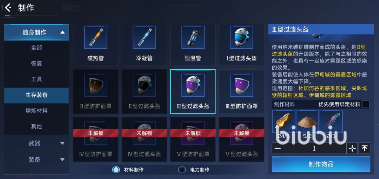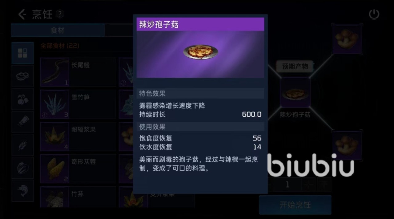 需要區(qū)分的是一定要制作過(guò)濾頭盔,而不是防護(hù)面罩,防護(hù)面罩并不能起到防霧霾作用,澳門(mén)一肖一碼精準(zhǔn)資料論壇只是用于大霧天氣,沙塵暴,暴風(fēng)雪等惡劣天氣,并不能隔絕霧霾、輻射等造成影響。很多玩家往往在這方面制作錯(cuò)誤,澳門(mén)一肖一碼高手論壇不僅浪費(fèi)資源,還使自己陷入比較危險(xiǎn)境地。另外還有一項(xiàng)烹飪辣炒孢子菇也是比較關(guān)鍵道具,使用之后能夠降低霧霾進(jìn)度條增長(zhǎng)速度,同樣起到防御目的。