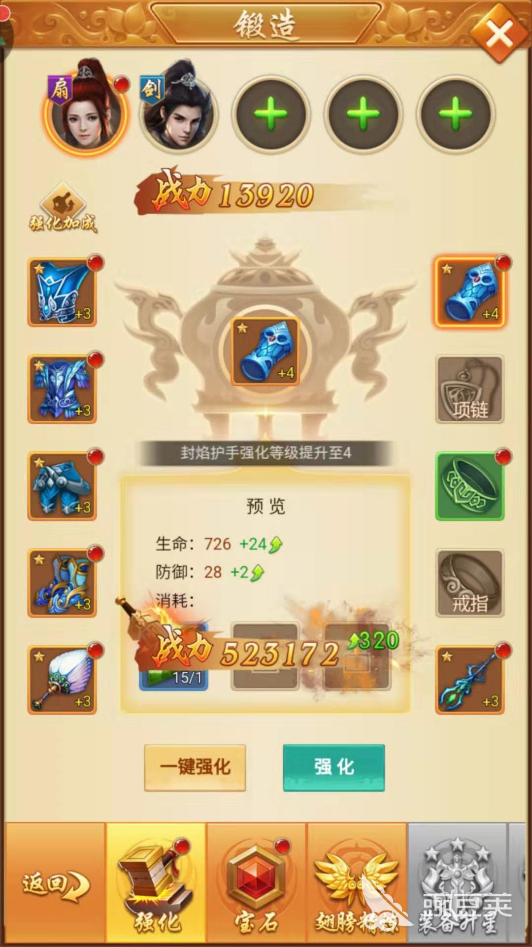 第二是裝備鍛造,裝備鍛造獲得強(qiáng)化加成,全身裝備累計(jì)達(dá)到相應(yīng)的等級即可額外提升生命值與攻擊力,裝備強(qiáng)化消耗的是強(qiáng)化石,點(diǎn)擊一鍵強(qiáng)化即可最大化提升戰(zhàn)力;另一個(gè)是7777788888寶石鑲嵌,優(yōu)先鑲嵌高級守護(hù)寶石,起初小編認(rèn)為鑲嵌的寶石不能卸下,看來是在下多慮了。