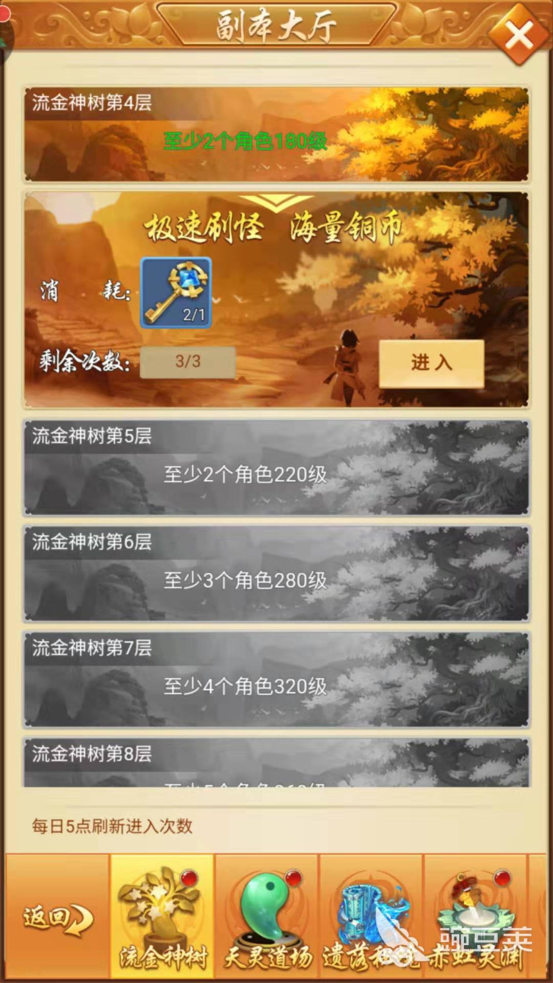 日常副本的重點(diǎn)在前兩塊:留金神樹和天靈道場副本一共十九層,每層只要指定英雄數(shù)量達(dá)到相應(yīng)等級即可解鎖,值得注意的是:假如玩家解鎖到第四層,就不能再去過前面三層的副本了,所以在等級還沒上去之前先將副本給挑戰(zhàn)了才是明智的選擇。