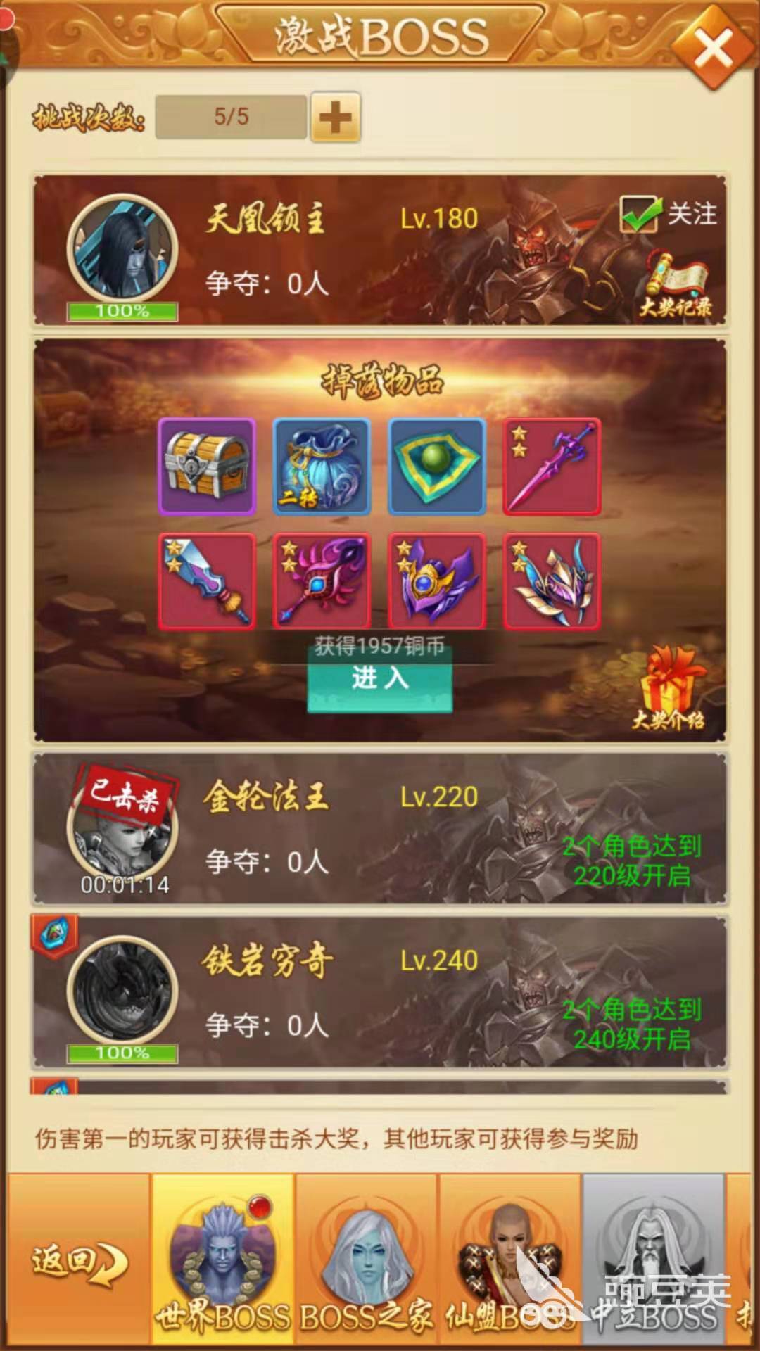 隨著等級的提升,boss的戰(zhàn)力也越來越強(qiáng),當(dāng)然,每天只有五次的挑戰(zhàn)機(jī)會(huì),機(jī)不可失,失不再來噢。