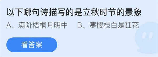 螞蟻莊園8月8日的螞蟻問題分別是:立秋時節(jié),古代有“梧桐報秋”的莊園最新習俗,猜猜與哪個成語有關?月日以下哪句詩描寫的是立秋時節(jié)的景象?下面小編給大家?guī)韱栴}的解答,還不清楚的答案小伙伴一起看吧。